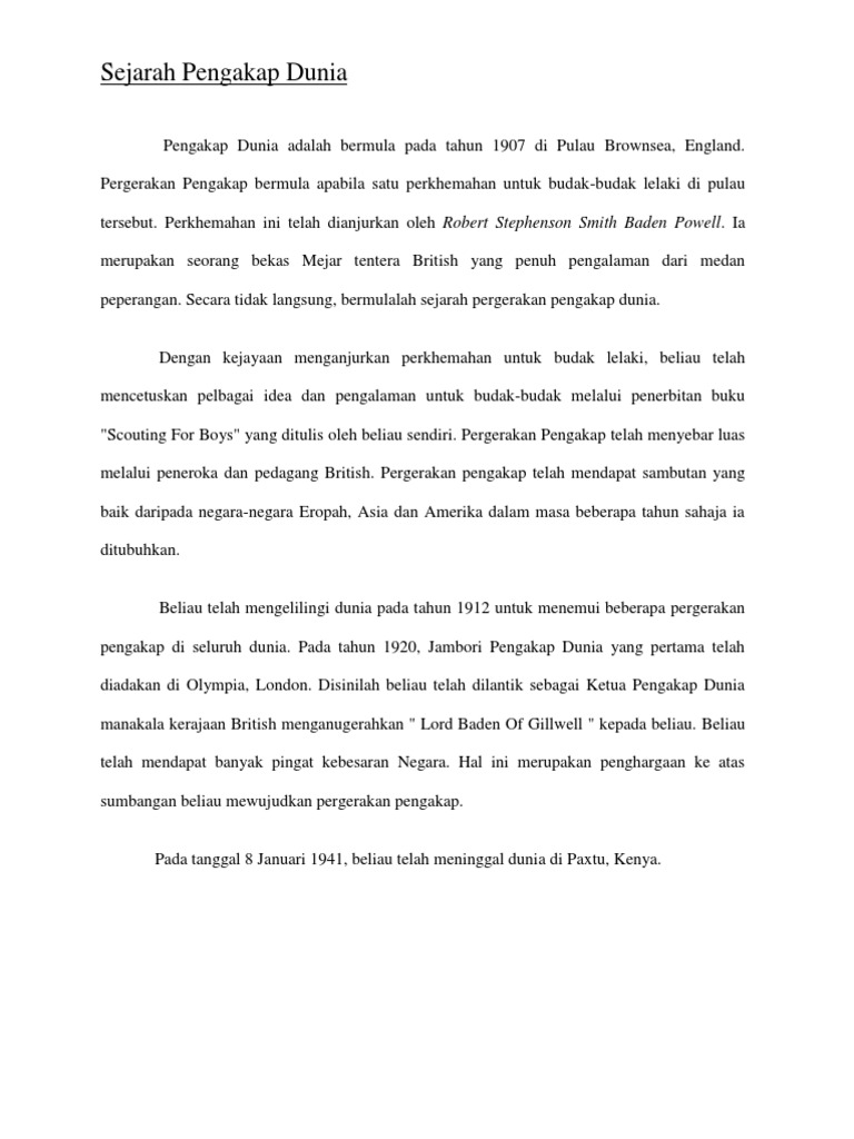 Buku Scouting For Boys telah dijadikan panduan untuk semua Pengakap dunia dan telah mengasaskan SUATU PERGERAKAN yang menyatukan budak-budak seluruh dunia kecuali negara-negara komunis. Check more flip ebooks related to e-BUKU LOG UB PENGAKAP of carlos07-348. - Hubungan Malaysia dengan biro pengakap dunia pada tahun 1954 dan asia pasifik pula pada tahun 1957.