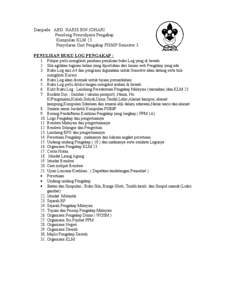 Pada tahun 1910 pergerakan ini berkembang begitu pesat sehingga memaksa BP yang berjawatan sebagai Leftenan Jeneral ketika itu mengambil keputusan untuk. View buku log pengakapdocx from MPU 3031 at Institut Pendidikan Guru Malaysia Kampus Tun Hussein Onn. Di dalam buku log ahli Pengakap Pemimpin juga boleh mencatat komen terhadap penulisan serta memberikan pengesahan terhadap ujian yang diambil oleh ahli Pengakap tersebut.